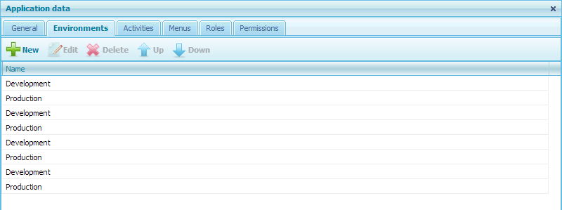 Para definir los ambientes de ejecución de la aplicación se deberá dar clic en la opción Ambientes y se presentará la siguiente pantalla. Los ambientes indican la