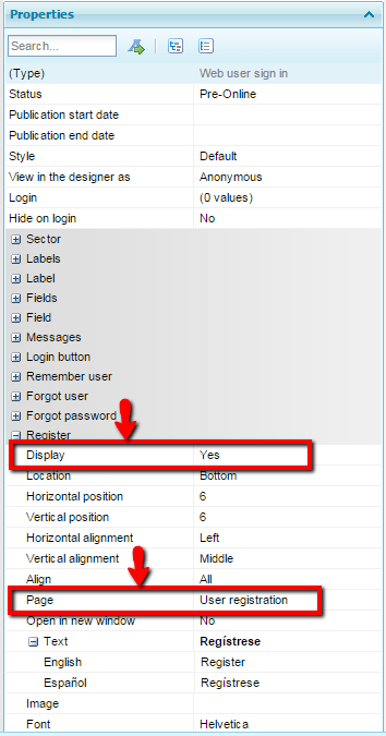 A link for registration may be enabled from the GXportlet “Web user sign in”. In such case, we should show this option in the group of properties "Register", and assign –in the "Page" property- a link to the page where the user will register, as shown in the image below: