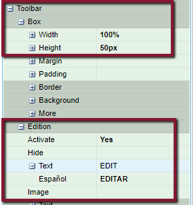 - In the Group “Toolbar” > “Edition” showing the Edition option, the following properties must be assigned: