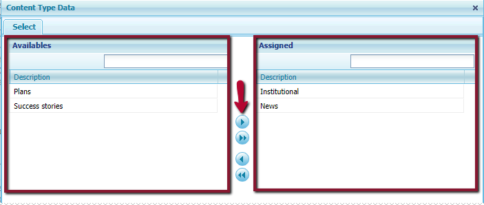 - The content types that may not be published in this block are shown on the left, and content types for which publication is allowed in this block are on the right. Using the buttons located between the two charts, the following may be done:
