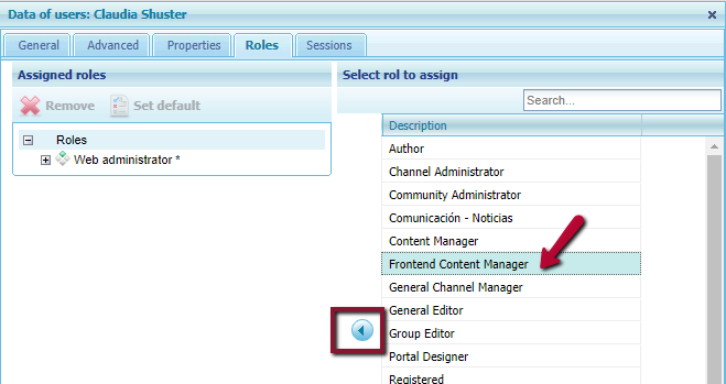 - For the role, indicate the corresponding content groups. For example: marketing, business, administrative, technical. Content groups are used when the content edition involves several users from different areas, otherwise the group “General” already created with the site is the one used.