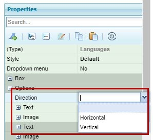 Example: The “Languages” block includes the “Direction” property in the “Options” properties group, for selecting whether the languages are shown horizontally or vertically.