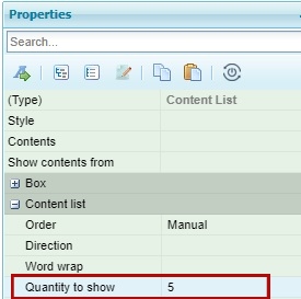 Example: The “Content List” block has the “Quantity to show” property in the “Content List” group, for determining the amount of contents shown.