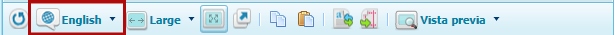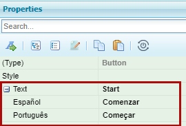Example 1: the “Button” block includes the “Text” property for entering the text that will be shown. The languages enables in the site are English, Spanish and Portuguese, and the page designer is shown in English.