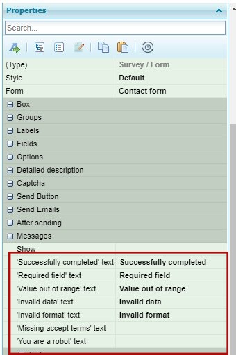 Example 2: The “Form” block, in the “Messages” group, has a property for each message, that may be shown when a form is fully completed (for example: “Form completed successfully”, or “Data is not valid”). The site has on English as the language allowed.
