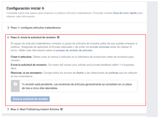 El “Paso 2” es que Facebook nos apruebe para poder publicar artículos instantáneos, para que nos aprueben debemos crear al menos 5 artículos en la sección de producción para que ellos validen de que están bien creados.