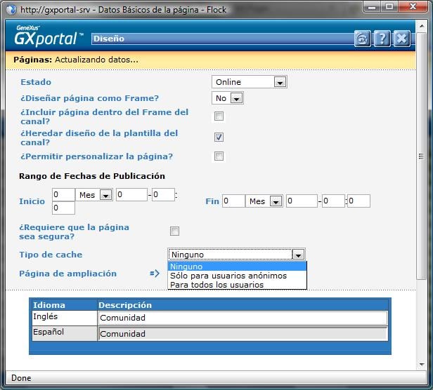 El combo “Tipo de cache” es el que determina si se almacenará o no el cache para la página. Los valores posibles son: