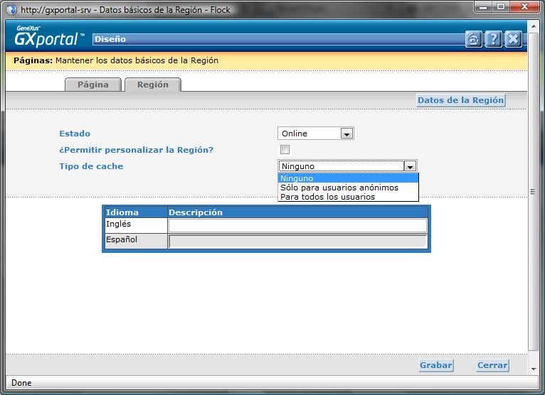 Si no se desea o no se puede (ver restricciones) usar el cache en toda la página entonces se lo puede configurar por región de la misma. Para esto se debe ir a modificar los datos de una región y aparecerá el mismo combo con las mismas opciones que ya se describieron en el punto anterior.