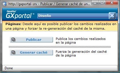 Desde el botón “Publicar” en el trabajar con páginas aparece el siguiente diálogo. La opción Publicar además de publicar todos los cambios hace que se genere el cache para las regiones que corresponda. La opción “Generar cache” únicamente regenera el cache para las regiones que correspondan y no publica, por ejemplo, sectores nuevos que pudieron ser agregados en la región.