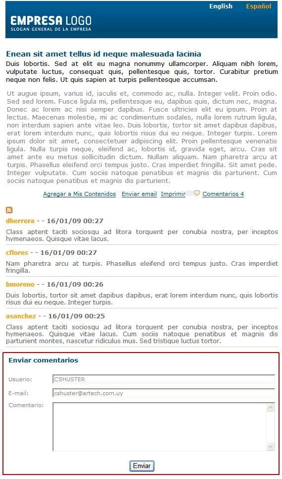 Para que los usuarios que están navegando por el portal puedan comentar las noticias e información que se publica en el mismo, se deberá ir a las propiedades del GXportlet de contenido y configurar lo siguiente: