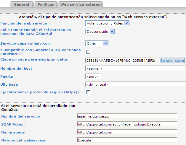 2. Configurar en GXportal los datos del web service como se muestra en la imagen y salvar esa configuración:
