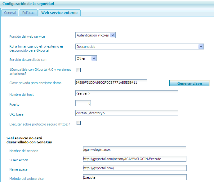 2. Configurar en GXportal los datos del web service como se muestra en la imagen y salvar esa configuración: