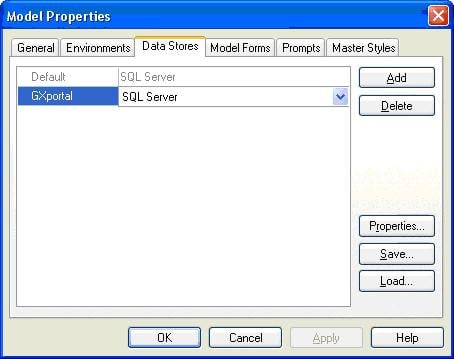 Lo primero que se debe realizar, es definir en su KB un DataStore con el nombre GXportal. El Data View debe ser definido en modo Prototipo, desde el menú “File” - “Edit Model”, se desplegará una ventana como la que muestra la figura que se despliega a continuación, en la cual se debe seleccionar la pestaña “Data Stores”, dando clic en el botón “Add” se solicitará el nombre del Data Store a generar, el mismo deberá tener el nombre “GXportal”, luego de creado se debe configurar la información de conexión a la base de datos de GXportal, para ello se debe seleccionar el Data Store “GXportal” y dar clic en el botón Properties.