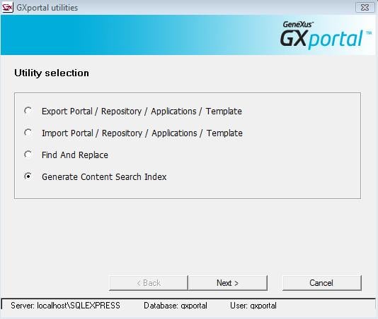 Ir al servidor donde se haya instalado el Backend de GXportal y ejecutar la opción “GXportal Tools” desde el grupo de programas de GXportal o utilizar la aplicación gxptools.bat ubicada en el directorio C:\Program Files\Artech\GXportal\Tools.