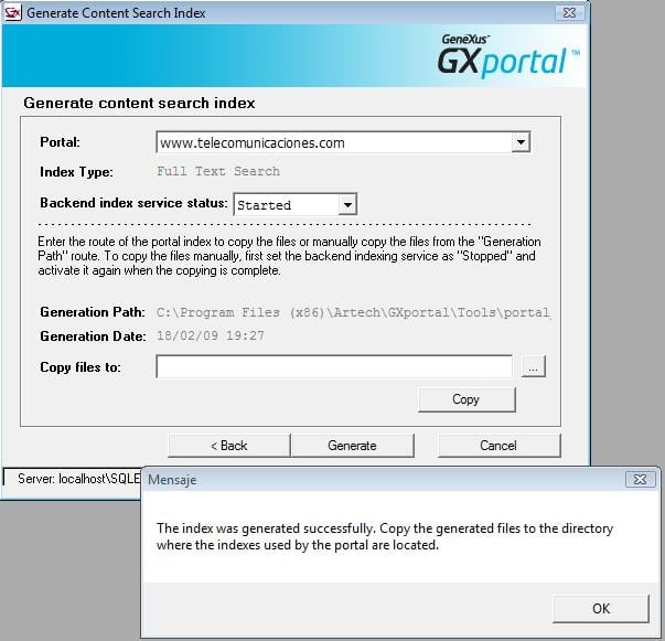 Seleccionar el portal sobre el cual se quiere regenerar el índice y presionar el botón Generate. Al final del proceso aparece el siguiente mensaje:
