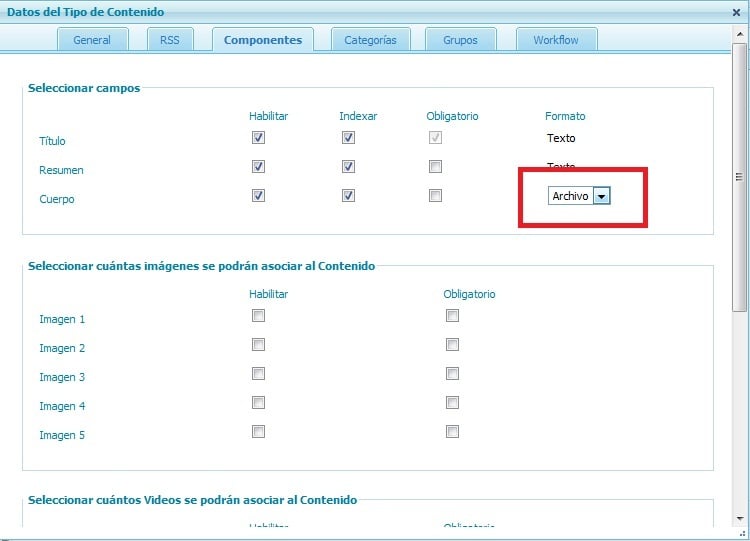 Lo primero que hay que hacer es crear un Tipo de Contenido por ejemplo Archivos de Descarga (el nombre puede ser cualquiera) , al crearlo tenemos que configurar las propiedades para que funcione como tal. En la siguiente pantalla le mostramos.
