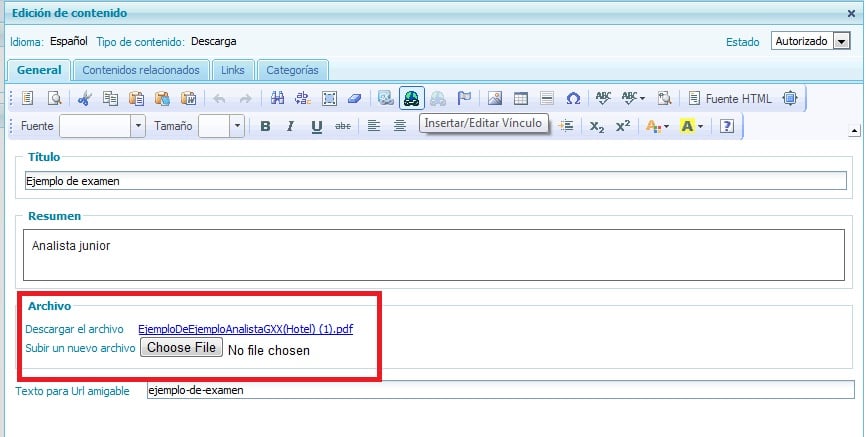 Luego tenemos que crear un contenido , que sea del tipo que creamos anteriormente , y vamos a ver la opción , para subir un archivo, como muestra la siguiente pantalla.
