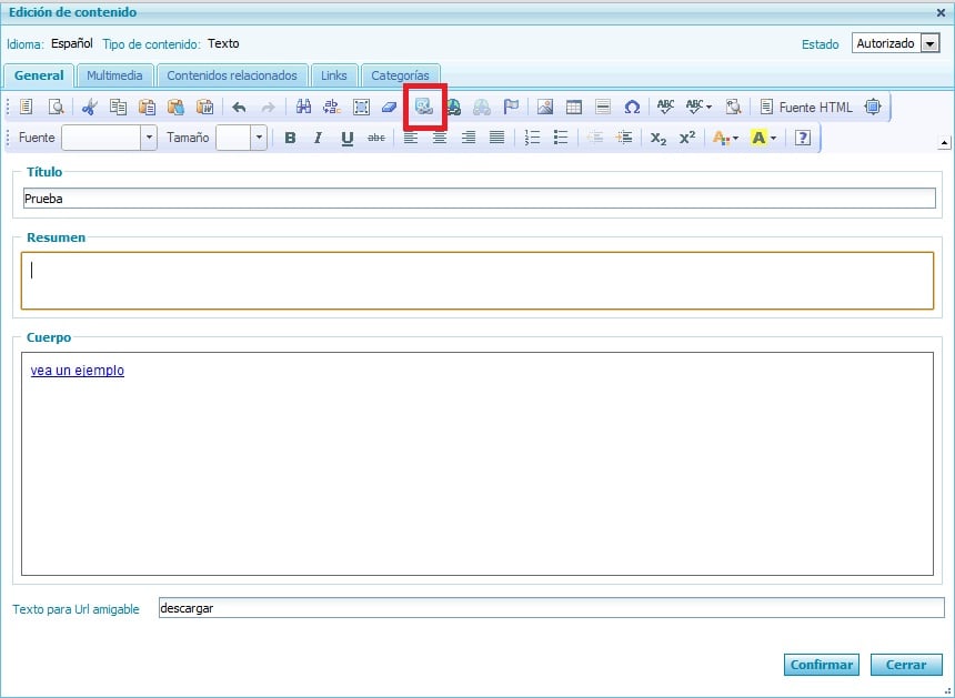 Por ultimo , en el contenido en el cual queremos tener el link para descargar el pdf , lo editamos, seleccionamos o escribimos la palabra donde queremos el link , y seleccionando el botón que aparece en la próxima imagen , seleccionamos el link.