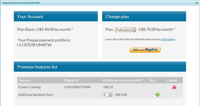 Desde la opción “mi cuenta” en el panel de control dependiendo del plan contratado se habilitará una tabla de funcionalidades premium donde simplemente presionando el botón comprar sobre la funcionalidad que se quiera se lo redireccionará a Paypal para confirmar una nueva suscripción mensual de pagos por la funcionalidad elegida.