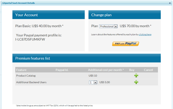Desde el panel de control del sitio tiene una nueva opción “Mi cuenta” que le permite acceder a consultar el estado de su cuenta además de tener opción para cambiar a un plan con más funcionalidades y además se permite agregar o quitar funcionalidades o usuarios backend.
