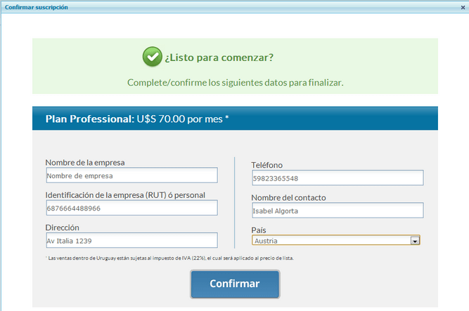 Si opta por cambiar de plan se lo redireccionará a Paypal para confirmar la nueva suscripción, cuando confirme esto volverá al backend donde se presentará la siguiente pantalla para confirmar o modificar los datos de facturación, luego de confirmar se cancelará la suscripción del plan que tenía antes, se confirmará el nuevo plan y podrá comenzar a usar las funcionalidades que le ofrece el nuevo plan.