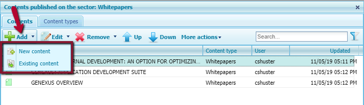 - Luego de hacer clic sobre la opción “Nuevo contenido”, se presentan los tipos de contenidos que cumplen con las siguientes condiciones: