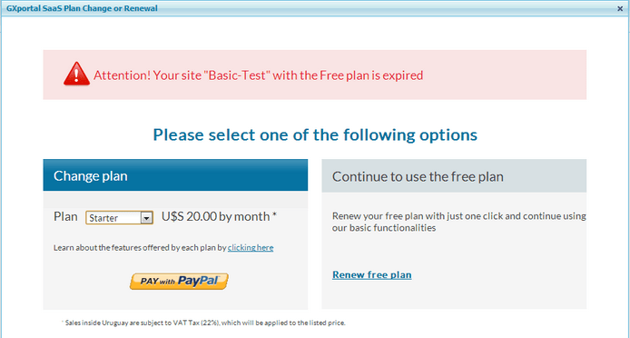 Caso o site tenha expirado, quando o usuário entrar, será apresentada a tela que vemos abaixo. Nela, é possível renovar o site com o plano gratuito ou mudar para outro com mais funcionalidades.