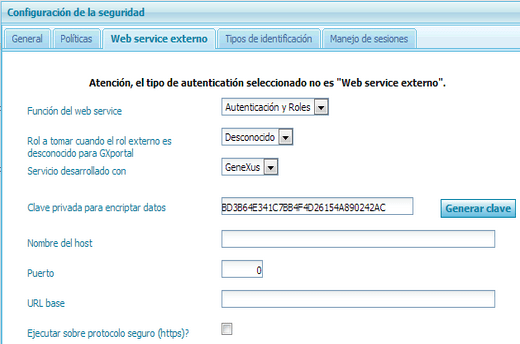 Private encription key: esta chave deve ser gerada no backend do site em GXportal, no painel de controle da opção de Segurança. Aí, no tab Web Service Externo, pressionamos o botão “Gerar chave” e depois pressionamos Gravar para salvar este valor. Depois, devemos copiar essa chave gerada e utilizá-la no backend do GAM para definir o campo Private encription key.