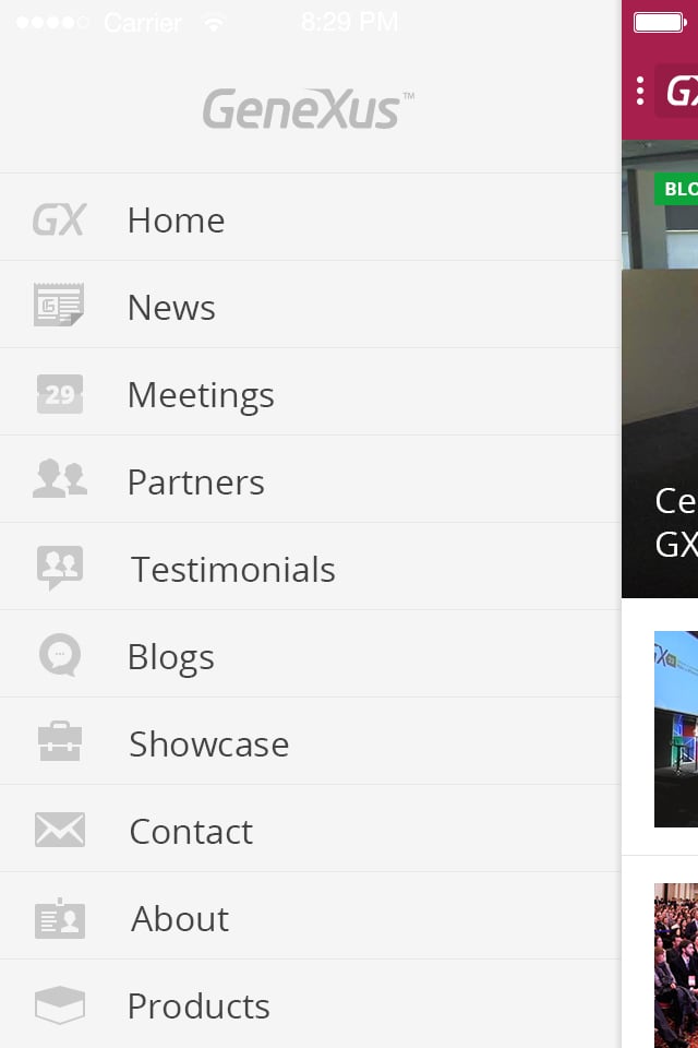 Vemos a descrição do processo que consiste em definir o menu de navegação do site para celulares, seguido da configuração do tipo de tela para cada opção de menu, do design e, por último, a opção de gerar os aplicativos nativos para iOS e Android. Os aplicativos serão gerados e publicados pela equipe de suporte de GXportal, tanto para Apple Strore, como para o Google Play.