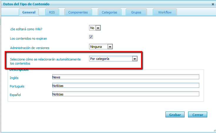 2. O tipo de conteúdo deve ter definido que os conteúdos se relacionem automaticamente por categoria ou por Categoria ou Subcategoria, como vemos na imagem abaixo: